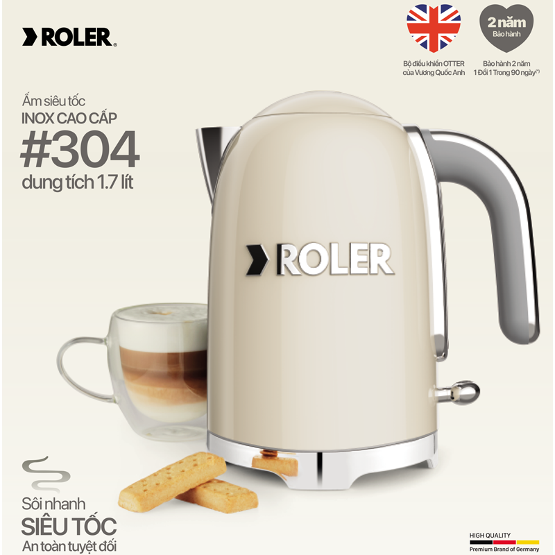 Với công suất lớn 1850W, ấm siêu tốc Roler nhanh chóng đun sôi chỉ trong 2 phút, đun nước nhanh sôi, tiết kiệm thời gian, điện năng. Bạn không phải chờ lâu để có nước nóng phục vụ nhu cầu sử dụng tức thời.