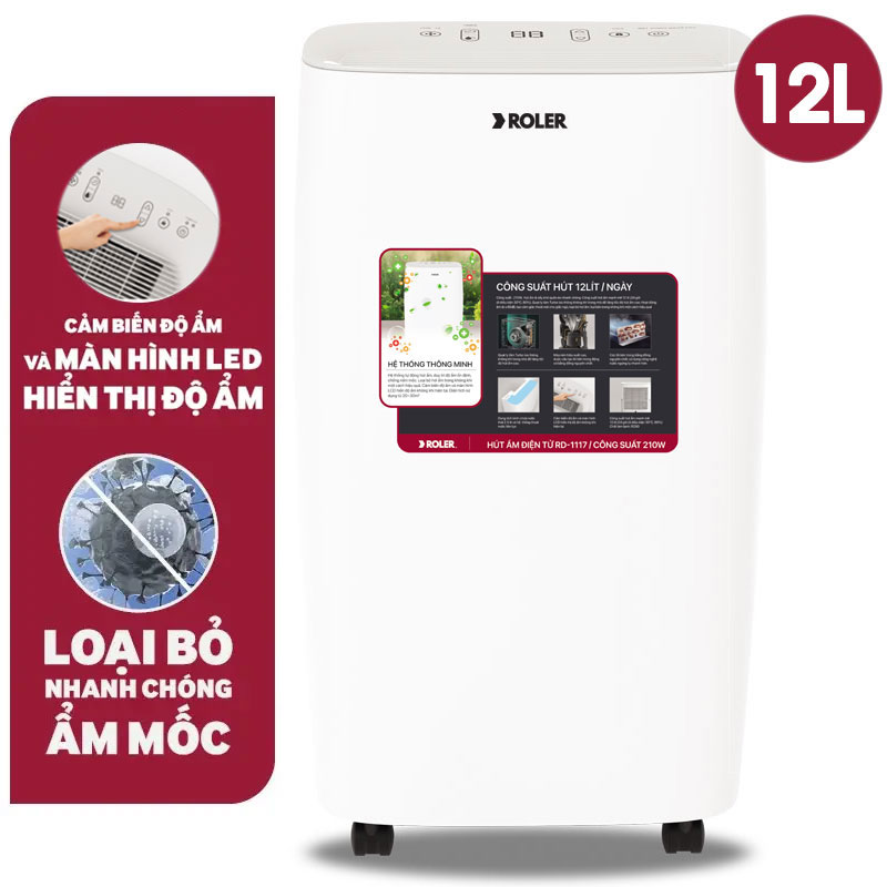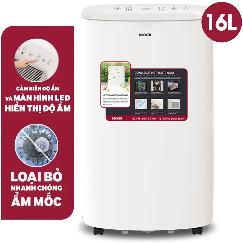 Máy hút ẩm điện tử 24 lít ROLER RD-1113 tự động tắt, tự động khởi động lại, tự động rã đông ở nhiệt độ thấp, hẹn giờ TẮT/MỞ trong vòng 24 tiếng. Máy có khả năng cảm biến độ ẩm và màn hình hiển thị độ ẩm không khí hiện tại.